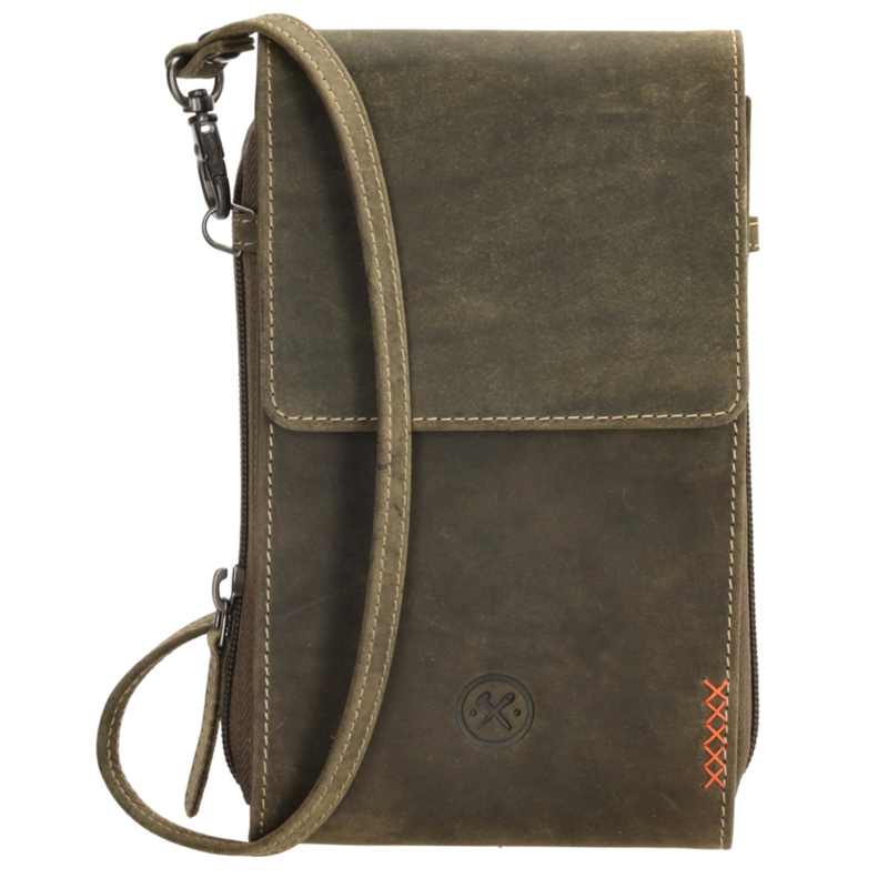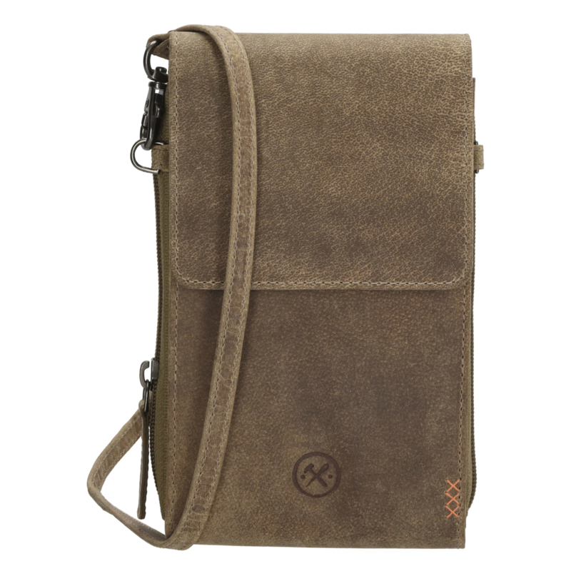 LEREN TASJEDit olijfkleurige telefoontasje is ideaal in het dagelijkse gebruik. Hij is afkomstig uit de Idaho collectie van Hide & Stitches. Je draagt hem aan de verstelbare en afneembare schouderband. Het tasje sluit met een overslag en in…